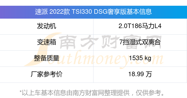 在動(dòng)力上,速派 2022款 TSI330 DSG奢享版配備的是一臺(tái)2.0T186馬力L4渦輪增壓發(fā)動(dòng)機(jī),匹配的是7擋濕式雙離合自動(dòng)檔變速箱,燃料形式為汽油,常規(guī)整備質(zhì)量1535kg,廠家參考價(jià)18.99萬(wàn)元。