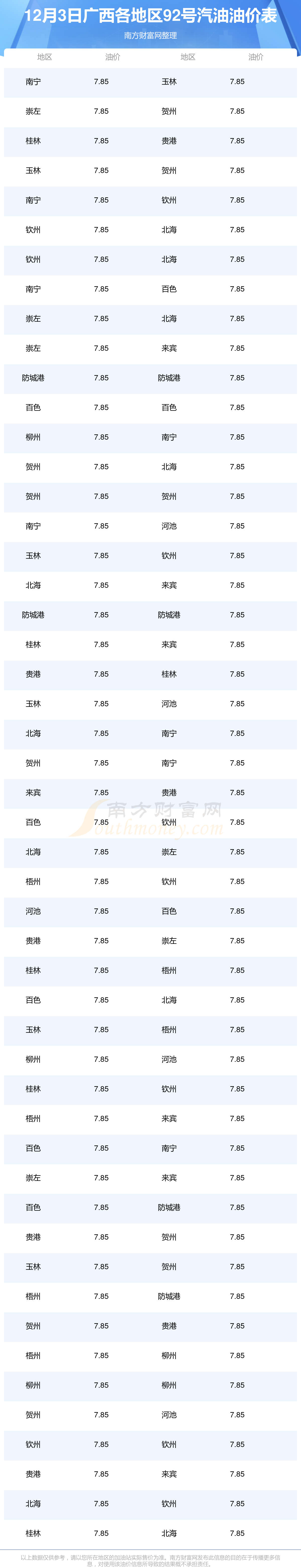 2025年12月3日廣西92號汽油最新價格一覽表