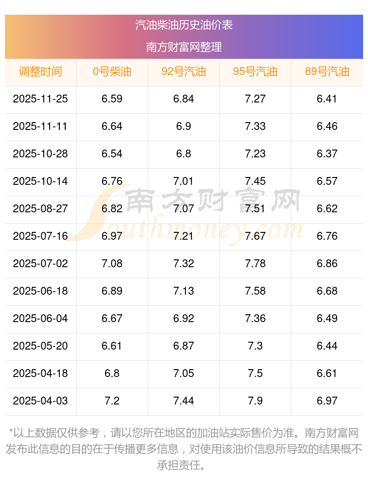 12月3日株洲92號汽油的價格為6.84元每升,本次調(diào)整時間為11月25日,相對上次調(diào)整時間11月11日的油價6.9元每升,下調(diào)了0.06元,下調(diào)幅達0.807%。下一輪油價調(diào)整時間12月8日24時,距離現(xiàn)在還有5.48天。