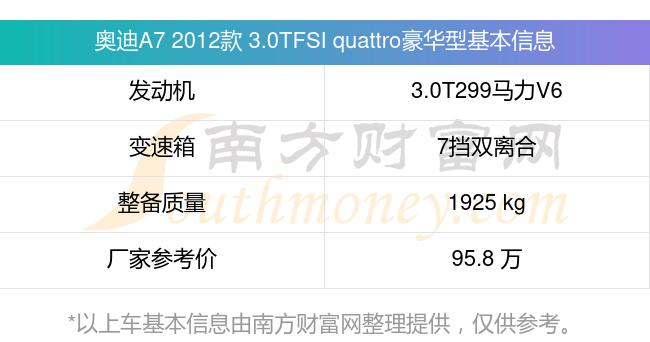 奧迪A7 2012款 3.0TFSI quattro豪華型動力方面,搭載的是一臺3.0T299馬力V6機械增壓發(fā)動機,匹配7擋雙離合自動檔變速箱,燃料形式為汽油,常規(guī)整備質量1925kg,廠家參考價95.8萬元。