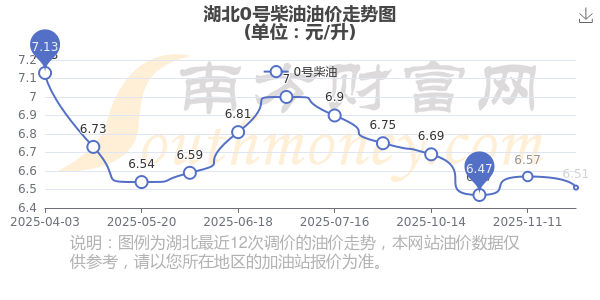 12月3日,湖北0號(hào)柴油的價(jià)格是6.51元每升,本次的調(diào)整時(shí)間為11月25日,對(duì)比上次的調(diào)整跌了0.06元,跌0.913%,12月8日24時(shí)為下一輪油價(jià)調(diào)整時(shí)間,還有5.46天。