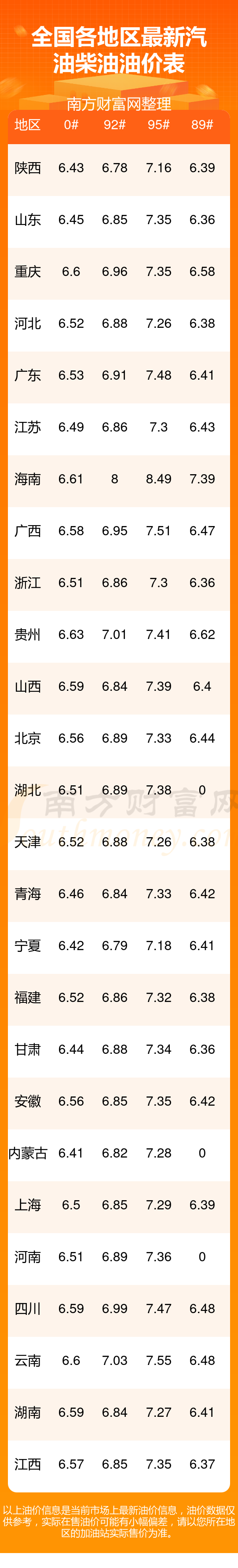 油價(jià)數(shù)據(jù)僅供參考,請(qǐng)以您所在地區(qū)的加油站報(bào)價(jià)為準(zhǔn)。南方財(cái)富網(wǎng)發(fā)布此信息的目的在于傳播更多信息,對(duì)使用該油價(jià)信息所導(dǎo)致的結(jié)果概不承擔(dān)任何責(zé)任。