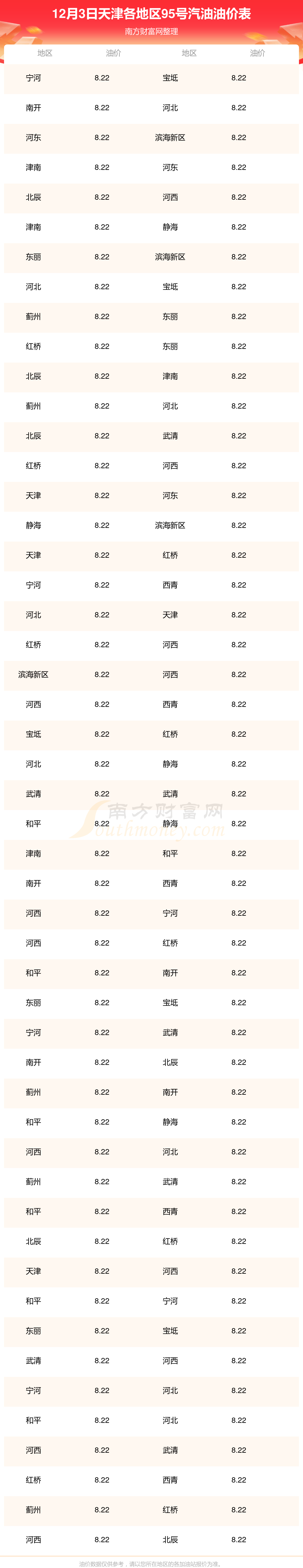 2025年12月3日天津95號(hào)汽油最新價(jià)格一覽表