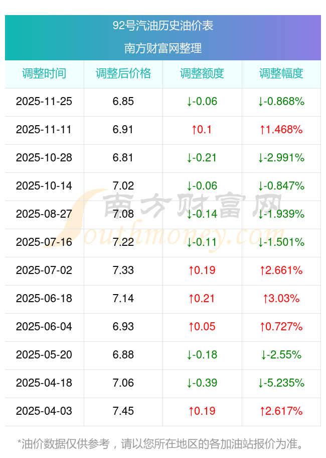 汽油、柴油12月3日價格多少錢一升?具體為:0號柴油為6.5元,下調(diào)了0.06元;95號汽油為7.29元;92號汽油為6.85元;89號汽油為6.39元,調(diào)整時間為11月25日。下一輪油價調(diào)整時間12月8日24時,距離現(xiàn)在還有5.44天。