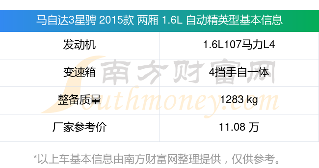 馬自達(dá)3星騁 2015款 兩廂 1.6L 自動(dòng)精英型動(dòng)力上配備的是一臺(tái)1.6L107馬力L4自然吸氣發(fā)動(dòng)機(jī),匹配的是4擋手自一體自動(dòng)檔變速箱,燃料形式為汽油,常規(guī)整備質(zhì)量1283kg,廠家參考價(jià)11.08萬(wàn)元。