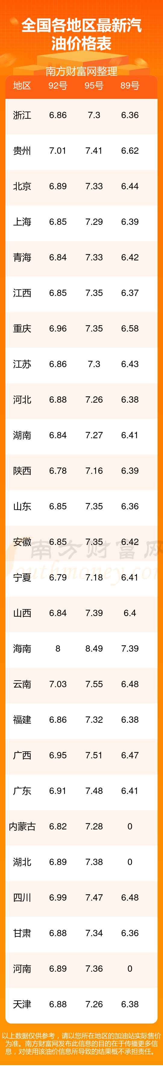 全國95號汽油最新平均價格為:7元每升,其中,最低為陜西,價格為7.16元/升,最高為海南,價格為8.49元/升。