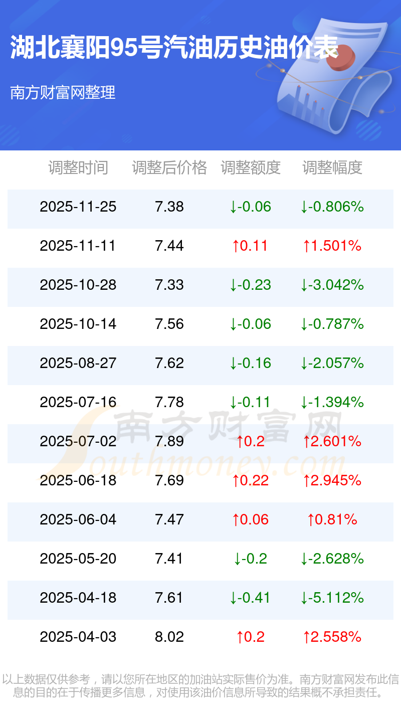 湖北襄陽95號汽油12月7日的最新價格(11月25日油價調(diào)整后的價格):湖北襄陽95號汽油7.38元/升,相對上次調(diào)整時間11月11日的油價7.44元每升,降了0.06元,降0.806%。下一輪油價調(diào)整時間12月8日24時,距離現(xiàn)在還有1.07天。