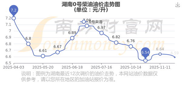 12月8日,湖南汽油、柴油每升的價格為:92號汽油6.84元,下降了0.06元;95號汽油7.27元,下降了0.06元;89號汽油6.41元,下降了0.05;0號柴油為6.59元,下降了0.06元,本輪調(diào)整時間是11月25日。
