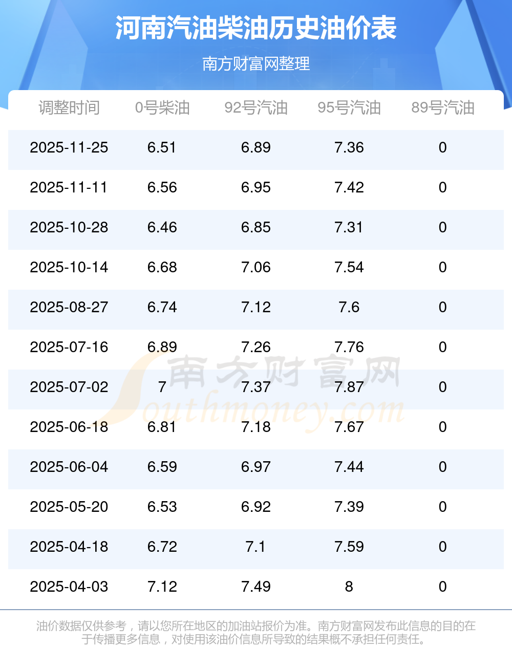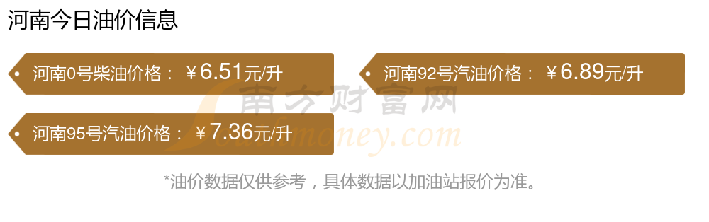 河南汽油、柴油12月8日每升最新價格為11月25日調(diào)整后的價格,92號汽油為6.89元,下調(diào)了0.06元;95號汽油為7.36元,下調(diào)了0.06元;0號柴油為6.51元,下調(diào)了0.05元。