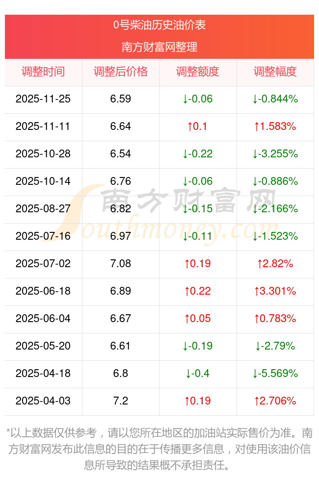 油價調(diào)整最新消息:下一輪油價調(diào)整時間12月8日24時。12月8日,湖南汽油、柴油的價格為11月25日調(diào)整后的價格。具體為:92號汽油6.84元,下跌了0.06元;95號汽油7.27元,下跌了0.06元;89號汽油6.41元,下跌了0.05;0號柴油6.59元,下跌了0.06元。