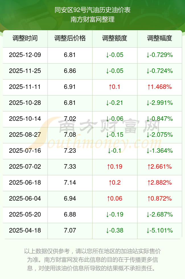 12月22日,同安區(qū)92號汽油今日價格(調(diào)整時間為12月9日):6.81元每升,對比上次調(diào)整(11月25日)的油價6.86元每升,共降了0.05元,降幅達0.729%。