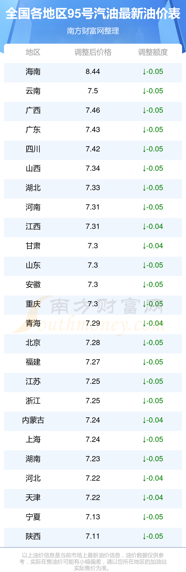 全國(guó)95號(hào)汽油最新平均價(jià)格為:7元每升,其中,最低為陜西,價(jià)格為7.11元/升,最高為海南,價(jià)格為8.44元/升。