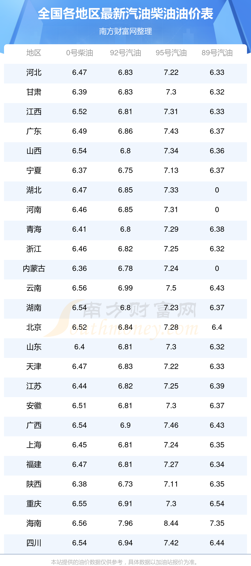 2025年12月22日全國各地汽油價(jià)格表一覽