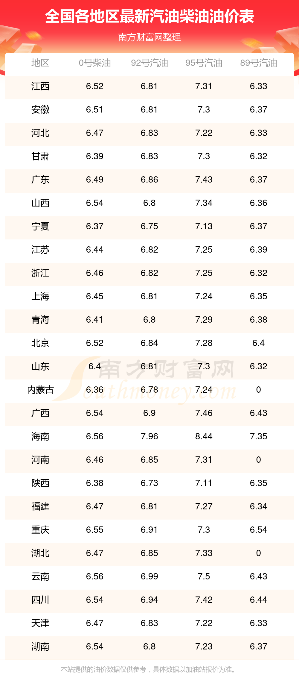 以上油價(jià)信息是當(dāng)前市場上最新油價(jià)信息,油價(jià)數(shù)據(jù)僅供參考,實(shí)際在售油價(jià)可能有小幅偏差,請(qǐng)以您所在地區(qū)的加油站實(shí)際售價(jià)為準(zhǔn)。