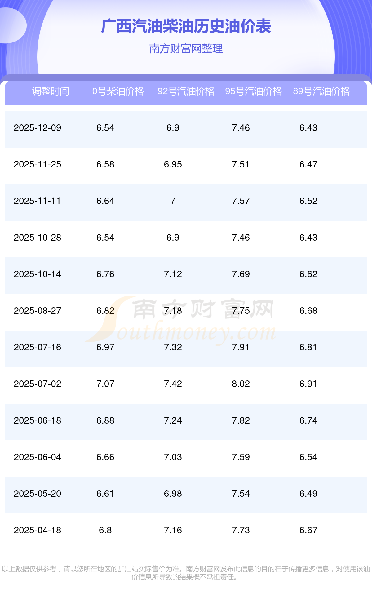 廣西2025年最新汽油柴油歷史油價表