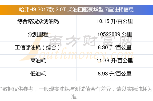 根據車主實測數據,該車型低油耗為8.93升/百公里,高油耗為11.38升/百公里,綜合路況眾測油耗為10.15升/百公里,工信部綜合油耗為8.30升/百公里。