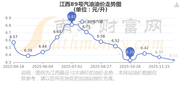 12月22日,江西89號(hào)汽油的價(jià)格是6.33元每升,本次的調(diào)整時(shí)間為12月9日,對(duì)比上次的調(diào)整跌了0.04元,跌0.628%,12月22日24時(shí)為下一輪油價(jià)調(diào)整時(shí)間,還有0.24天。
