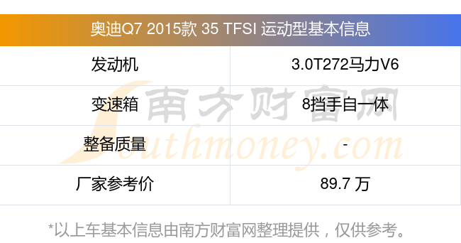 奧迪Q7 2015款 35 TFSI 運動型搭載了一臺3.0T272馬力V6機械增壓發(fā)動機,采用8擋手自一體自動檔變速箱,廠家參考價89.7萬元。