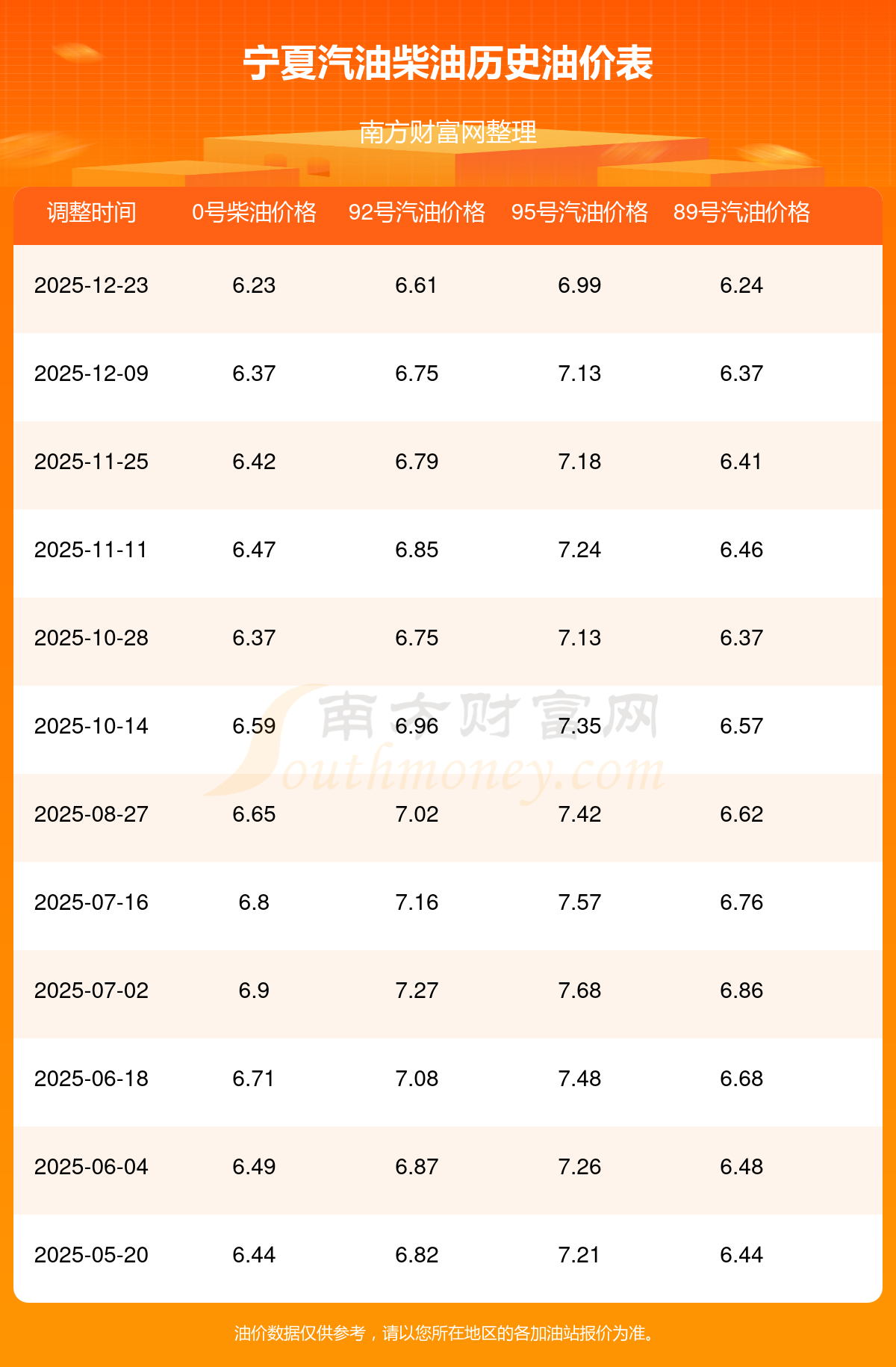 按12月23日95號汽油最新調整價格6.99元每升來計算(以寧夏為例),該車型百公里平均油費為98.419元,按上一輪12月9日調整價格7.13元每升來計算,百公里平均油費為100.39元,對比上一輪少花1.971元,下一輪油價調整時間為12月31日24時。