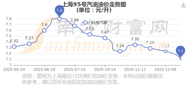 12月23日,上海95號汽油的價格是7.1元每升,本次的調(diào)整時間為12月23日,對比上次的調(diào)整下跌了0.14元,下跌1.934%,12月31日24時為下一輪油價調(diào)整時間,還有0天。