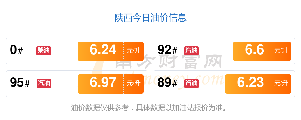 油價調(diào)整最新消息:12月24日,陜西西安汽油、柴油每升最新價格為:92號汽油為6.6元,下降了0.13元;95號汽油為6.97元,下降了0.14元;89號汽油為6.23元,下降了0.12元;0號柴油為6.24元,下降了0.14元,調(diào)整時間為12月23日。陜西西安下一輪油價調(diào)整時間12月31日24時,距離現(xiàn)在還有0天。