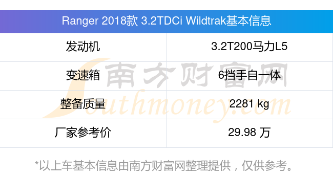 Ranger 2018款 3.2TDCi Wildtrak動(dòng)力上配備的是一臺(tái)3.2T200馬力L5渦輪增壓發(fā)動(dòng)機(jī),匹配的是6擋手自一體自動(dòng)檔變速箱,燃料形式為柴油,常規(guī)整備質(zhì)量2281kg,廠家參考價(jià)29.98萬元。