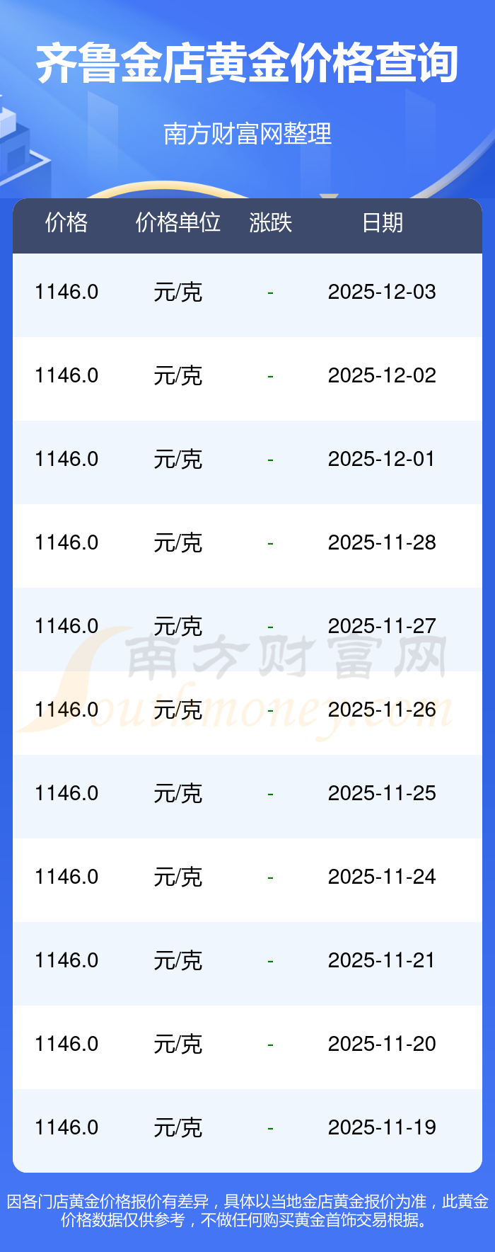 2025年12月4日齊魯金店黃金價(jià)格為1146.0元/克。