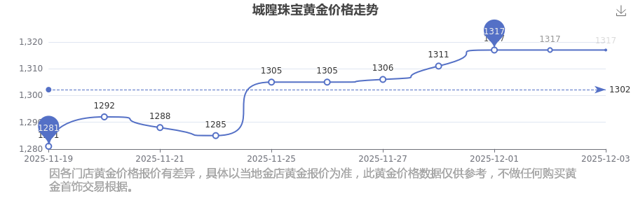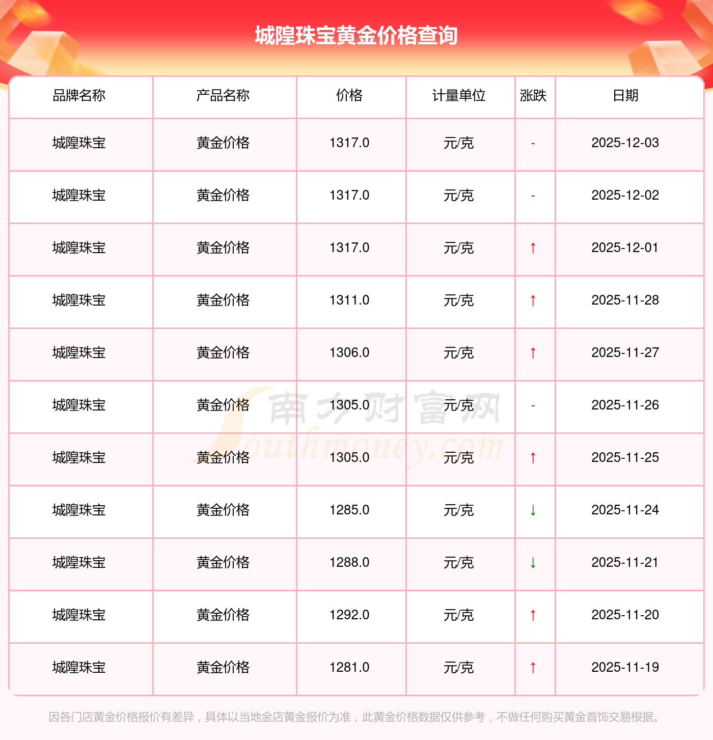 城隍珠寶 黃金價(jià)格于今日的最新掛牌價(jià)為1317.0元/克。