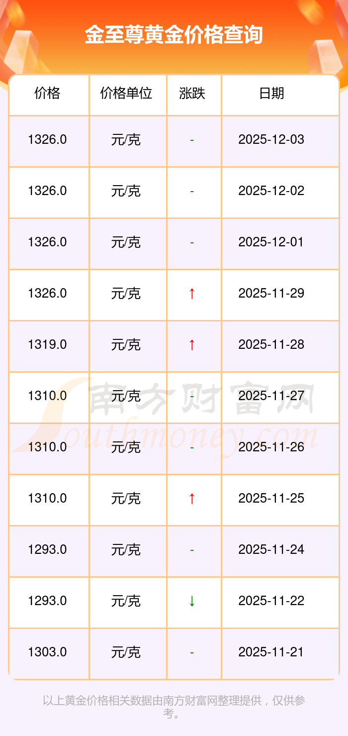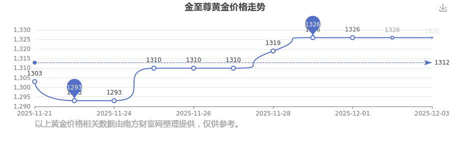 今日金至尊 黃金價(jià)格的最新定價(jià)為1326.0元/克。