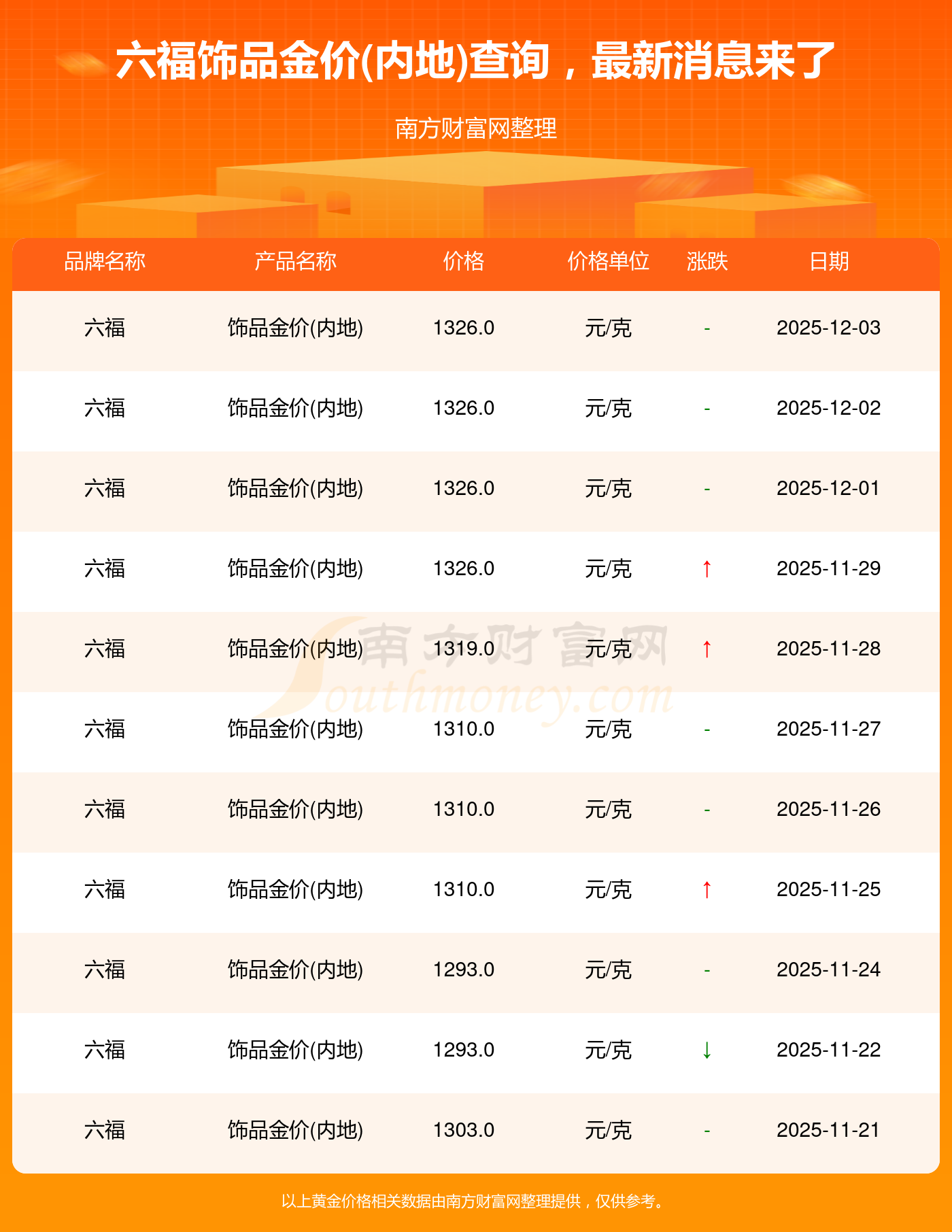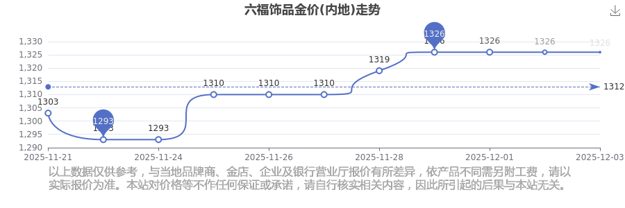 六福今日飾品金價(jià)(內(nèi)地)的最新標(biāo)價(jià)為1326.0元/克。