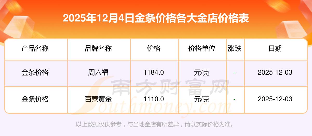 2025年12月4日各大金店金條價格最新價格:周大福1328.0元/克,周大福663.0元/克,周大福1328.0元/克,周大福46770.0,周大福18990.0,周大福42190.0,周大福1165.0元/克,老鳳祥1327.0元/克,老鳳祥600.0元/克,老鳳祥1327.0元/克,六福1326.0元/克。