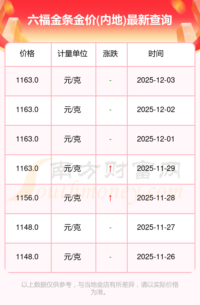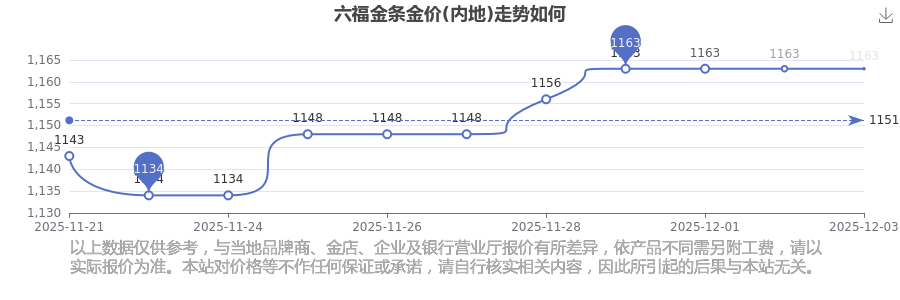 今日(2025年12月4日)六福金條金價(內(nèi)地)是1163.0元/克。