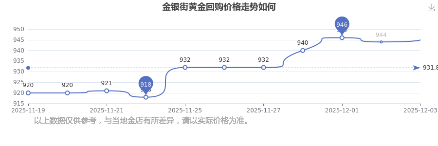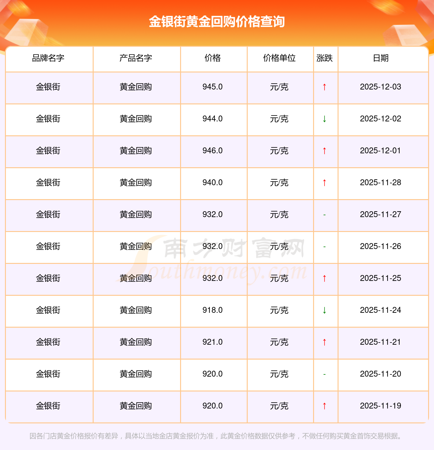2025年12月4日金銀街黃金回購(gòu)價(jià)格為945.0元/克。