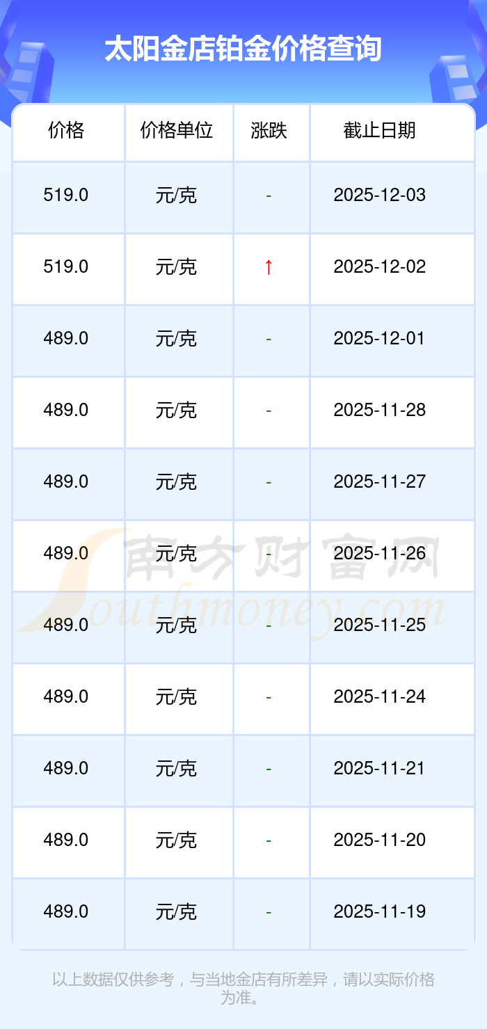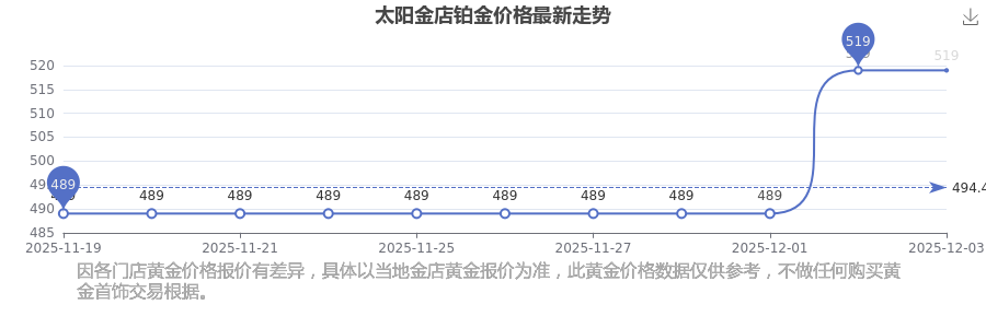 今日(2025年12月4日)太陽金店鉑金價(jià)格是519.0元/克。