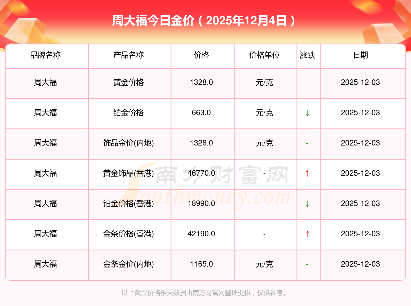 2025年12月4日周大福、周大福、周大福、周大福、周大福、周大福、周大福、老鳳祥、老鳳祥、老鳳祥、六福等各大金店品牌鉑金價格最新價格如下:周大福黃金價格1328.0元/克,周大福鉑金價格663.0元/克,周大福飾品金價(內(nèi)地)1328.0元/克,周大福黃金飾品(香港)