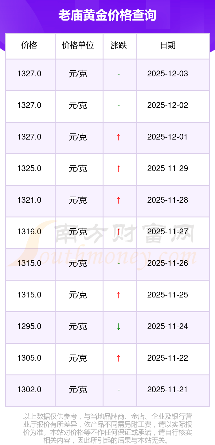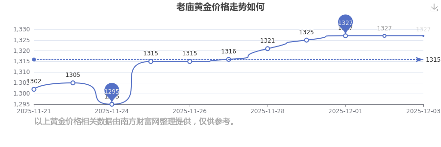 最新數(shù)據(jù)表明,老廟今日 黃金價(jià)格為1327.0元/克。