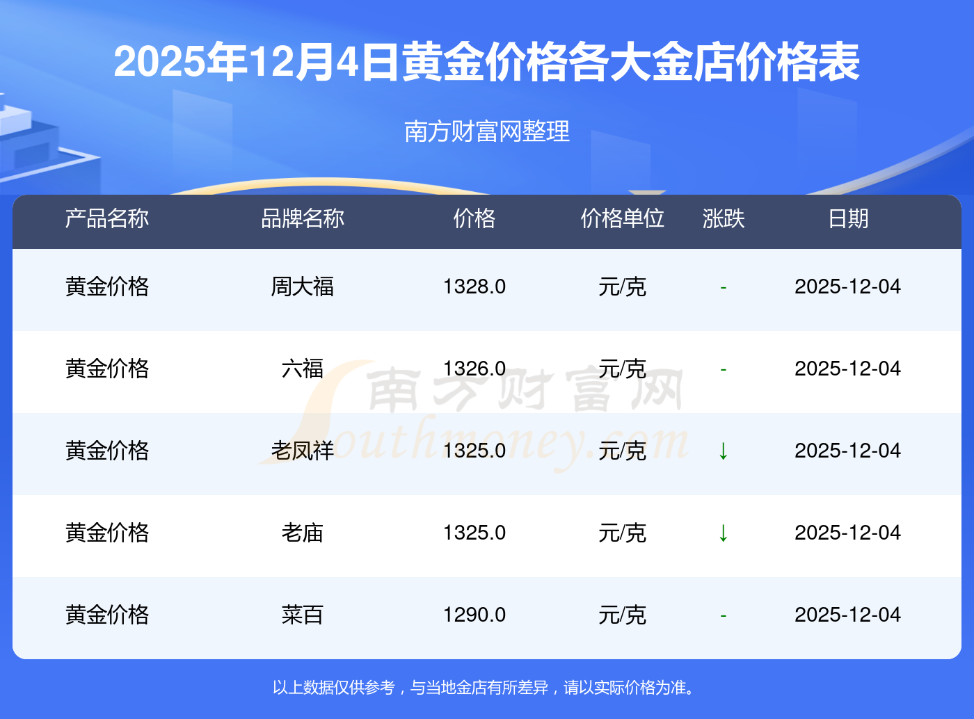 2025年12月4日,周大福、周大福、周大福、周大福、周大福、周大福、周大福、老鳳祥、老鳳祥、老鳳祥、六福等各大金店品牌黃金價(jià)格今日價(jià)格如下:周大福1328.0元/克、周大福671.0元/克、周大福1328.0元/克、周大福46730.0、周大福19260.0、周大福42160.0、周大福1165.0元/克、老鳳祥1325.0元/克、老鳳祥600.0元/克、老鳳祥1325.0元/克、六福1326.0元/克。