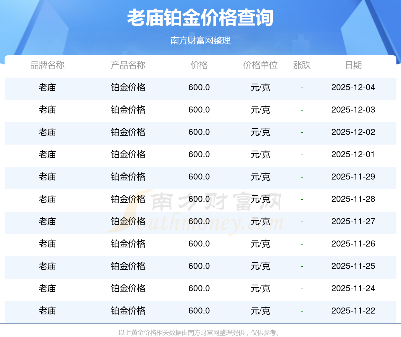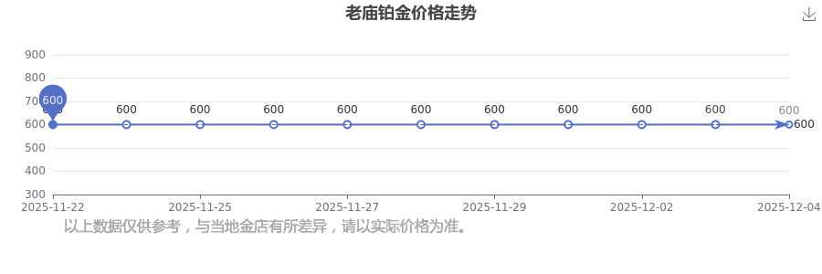今日(2025年12月4日)老廟鉑金價格為600.0元/克。