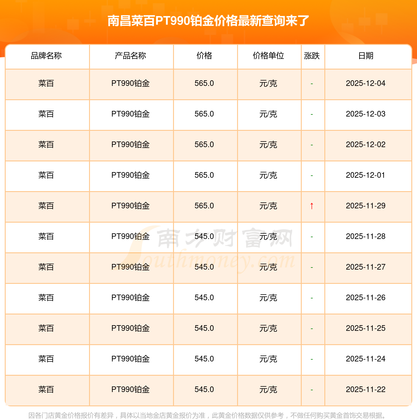 2025年12月4日,南昌菜百PT990鉑金每克的價(jià)值量定格在565.0元/克。