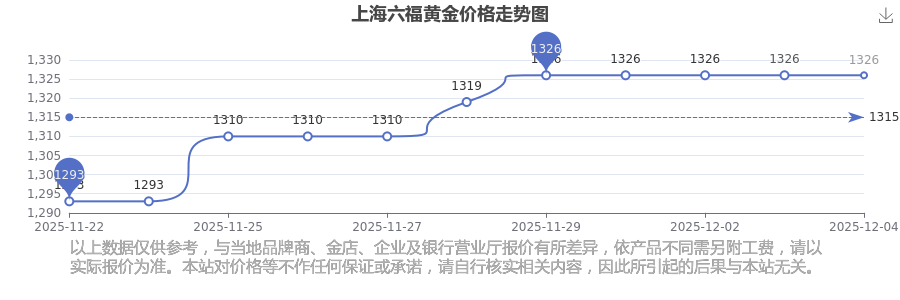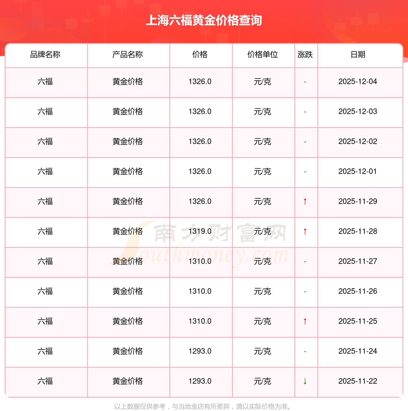 今日(2025年12月4日)上海六福黃金價格:1326.0元/克。