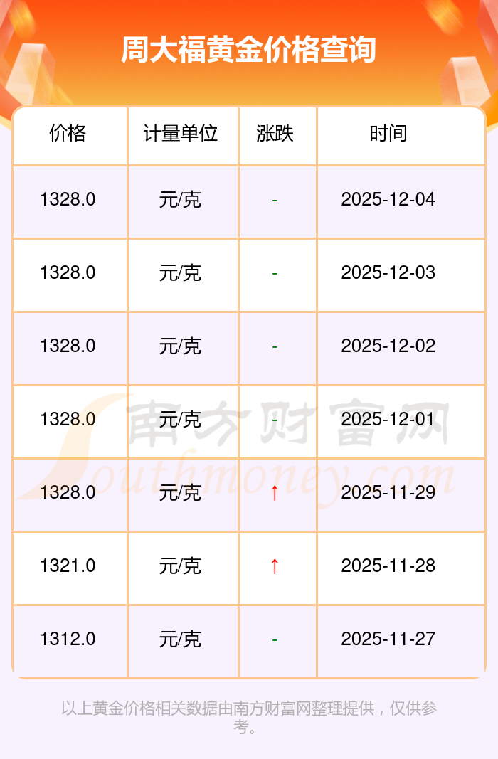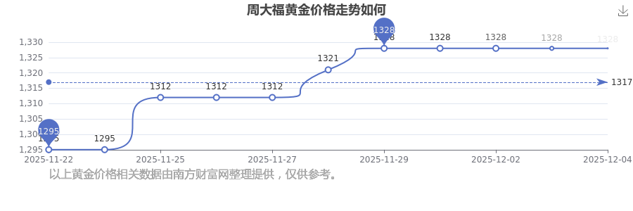 今日(2025年12月4日),周大福黃金價格最新價格是1328.0元/克。