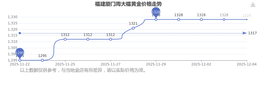 今日福建廈門周大福黃金價格為1328.0元/克。
