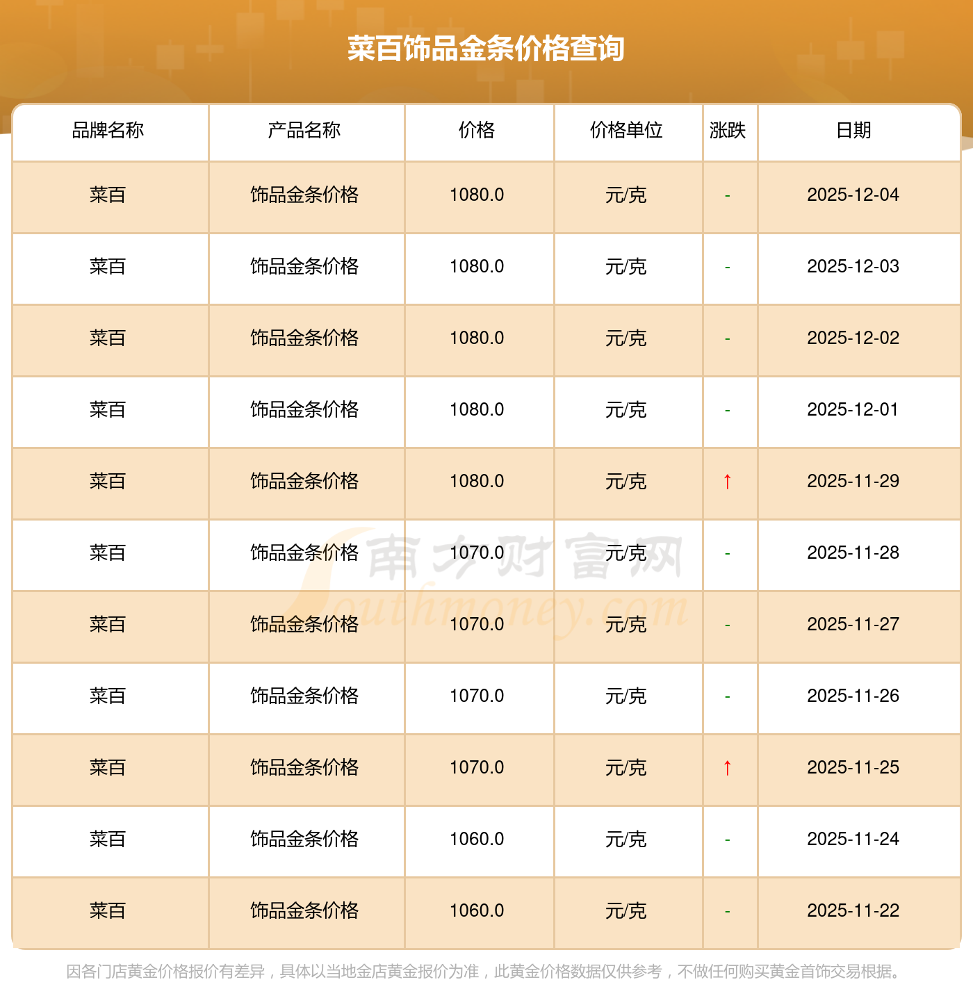 以上數(shù)據(jù)僅供參考,與當(dāng)?shù)仄放粕、金店、企業(yè)及銀行營(yíng)業(yè)廳報(bào)價(jià)有所差異,依產(chǎn)品不同需另附工費(fèi),請(qǐng)以實(shí)際報(bào)價(jià)為準(zhǔn)。本站對(duì)價(jià)格等不作任何保證或承諾,請(qǐng)自行核實(shí)相關(guān)內(nèi)容,因此所引起的后果與本站無(wú)關(guān)。