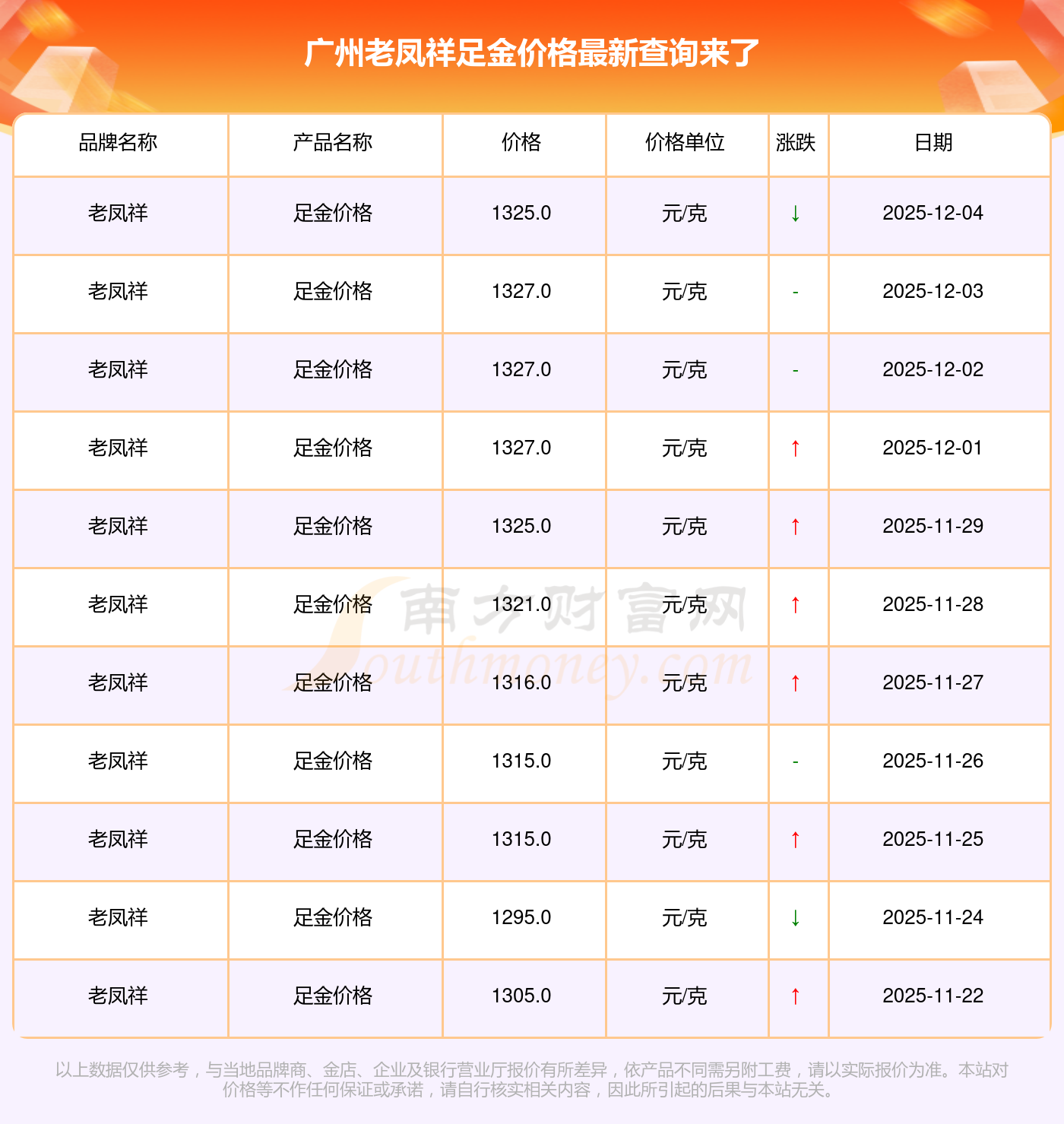 2025年12月4日廣州老鳳祥足金價格:1325.0元/克。