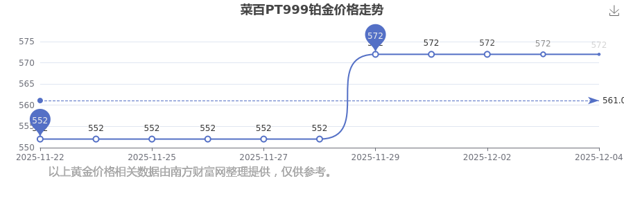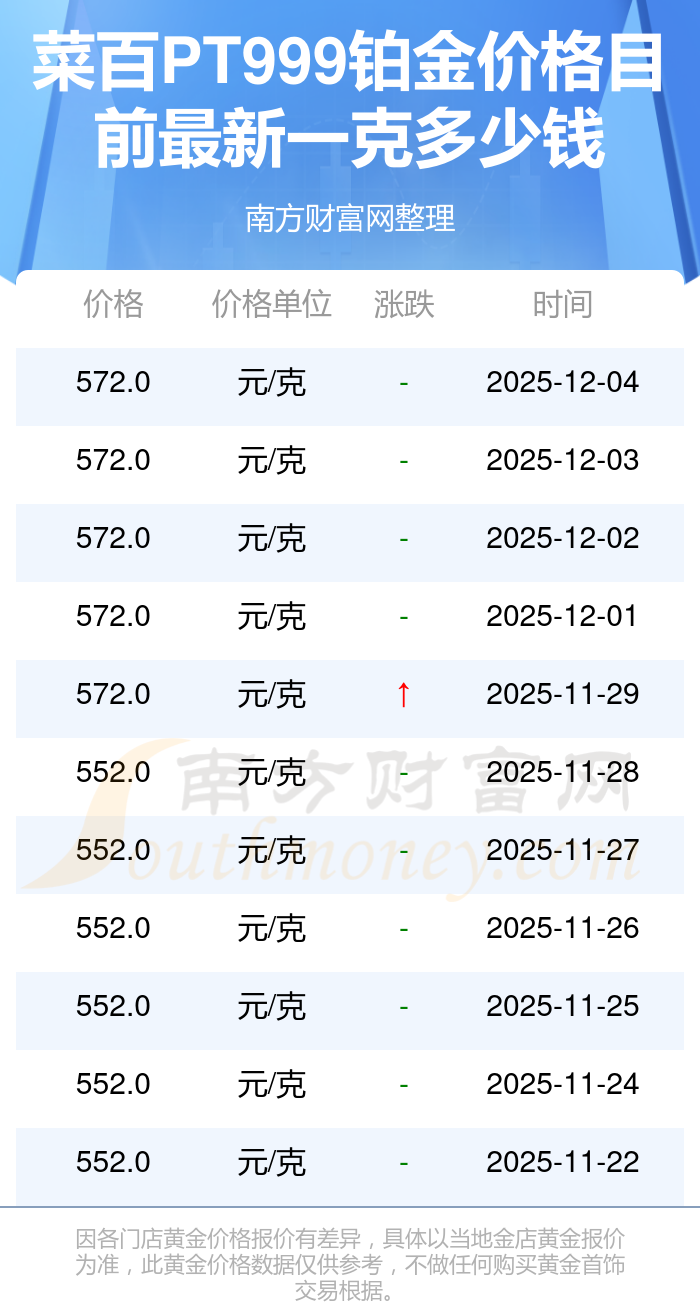 菜百 PT999鉑金今日最新的價(jià)位是572.0元/克。