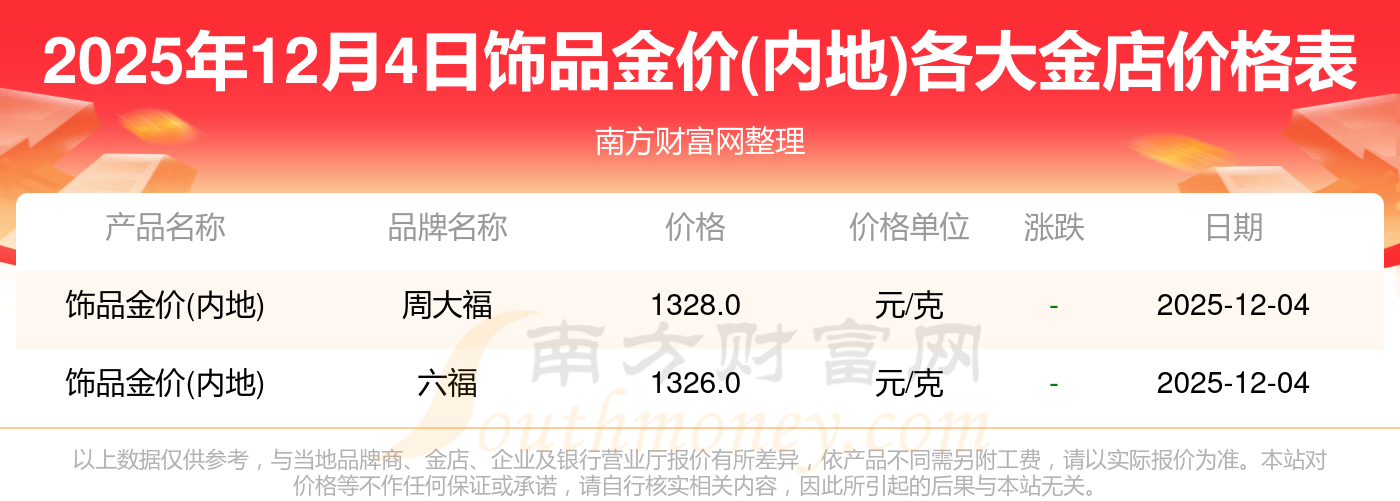 今天是2025年12月4日,周大福、周大福、周大福、周大福、周大福、周大福、周大福、老鳳祥、老鳳祥、老鳳祥、六福等各大金店品牌飾品金價(內(nèi)地)最新價格如下:周大福1328.0元/克、周大福671.0元/克、周大福1328.0元/克、周大福46730.0、周大福19260.0、周大福42160.0、周大福1165.0元/克、老鳳祥1325.0元/克、老鳳祥600.0元/克、老鳳祥1325.0元/克、六福1326.0元/克。