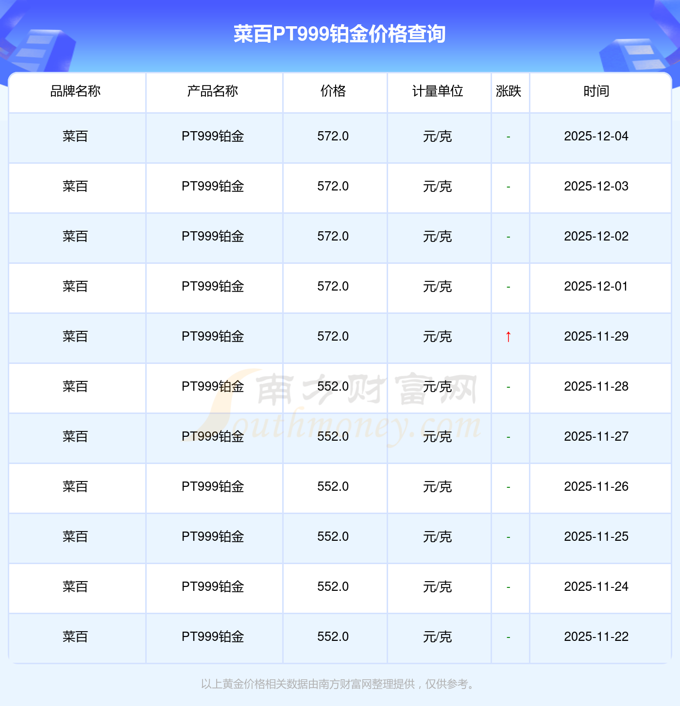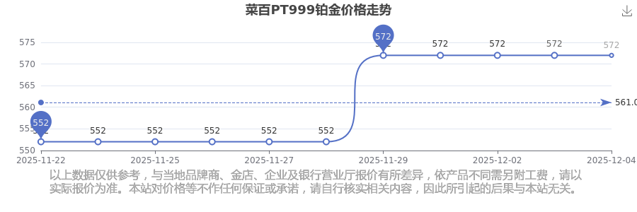 今日菜百 PT999鉑金最新的市場(chǎng)標(biāo)價(jià)為572.0元/克。