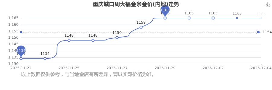今日重慶城口周大福金條金價(jià)(內(nèi)地):1165.0元/克。