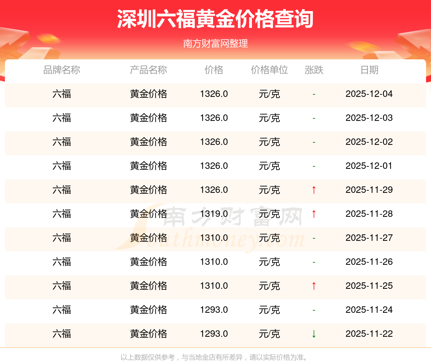 2025年12月4日,周大福、周大福、周大福、周大福、周大福、周大福、周大福、老鳳祥、老鳳祥、老鳳祥、六福等各大金店品牌黃金價格今日價格如下:周大福1328.0元/克、周大福671.0元/克、周大福1328.0元/克、周大福46730.0、周大福19260.0、周大福42160.0、周大福1165.0元/克、老鳳祥1325.0元/克、老鳳祥600.0元/克、老鳳祥1325.0元/克、六福1326.0元/克。