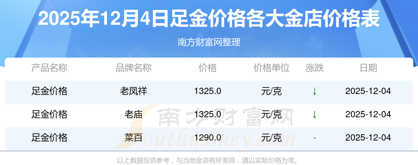 2025年12月4日,周大福、周大福、周大福、周大福、周大福、周大福、周大福、老鳳祥、老鳳祥、老鳳祥、六福等各大金店品牌足金價(jià)格今日價(jià)格如下:周大福1328.0元/克、周大福671.0元/克、周大福1328.0元/克、周大福46730.0、周大福19260.0、周大福42160.0、周大福1165.0元/克、老鳳祥1325.0元/克、老鳳祥600.0元/克、老鳳祥1325.0元/克、六福1326.0元/克。